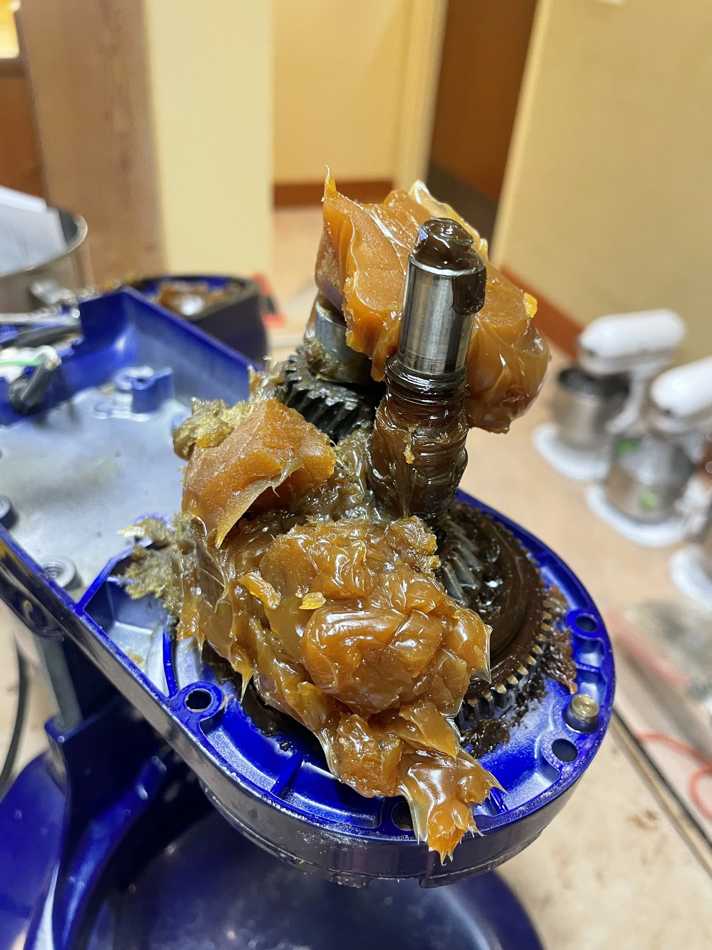 ***The worm drive gear is considered a “sacrificial gear” in the event a utensil falls into the bowl while an attachment is spinning. The teeth on the worm gear are plastic and immediately breaks to prevent the motor from burning out. I excavate the broken teeth from within the grease and replace the gear.